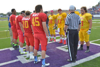The game began over 75 years ago when the "Big Red" of the West defeated the "Golden East" by a 33-13 margin with Missoula's Tommy Kingsford fancy-footing for the West.  The colors of the uniforms had been selected by the original Game Committee - red trimmed with gold for the West , and gold trimmed with red for the East - and these colors have been maintained to this day.